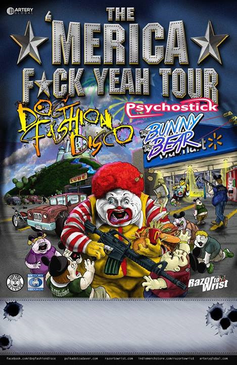 Dog Fashion Disco, Psychostick and The Bunny The Bear will be touring together this year as part of ‘The ‘Merica Fuck Yeah Tour‘. Dates remain pending for the trek, but you can check out the delightfully satirical admat for the tour featuring Ronald McDonald with an M16 below.