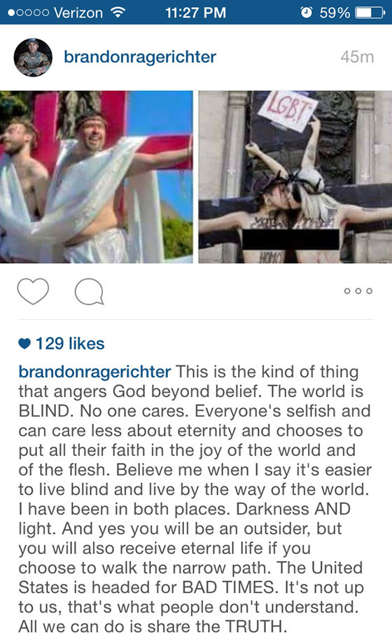Two images of apparent LGBT people mocking the crucifixion of Jesus Christ were attached the post. While Richter deleted the post, he later made another since-deleted post, stating that his comments were directed towards the ‘sacrilegious’ imagery, not the legalization of same-sex marriage. The band themselves have since posted the following: