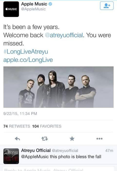 Apple have slowly been making some inroads into metal culture, be it their past placement of Deafheaven or their recent showcasing of Sevendust and more. It looks like there’s still some work to be done however, as the below tweet from the companies streaming service Apple Music welcomed Atreyu back to stores with an image of Blessthefall.