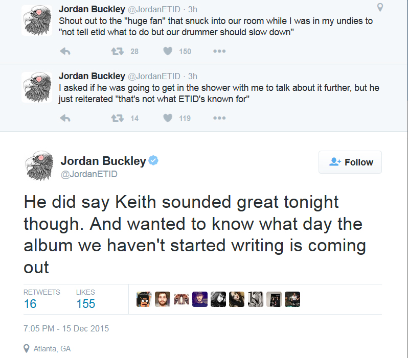 Every Time I Die are known to go off and apparently so do their fans. Below you can read an apparent exchange guitarist Jordan Buckley had with a fan who seems to have snuck backstage after the band’s show in Atlanta, GA tonight, December 15th. Buckley said of the encounter via Twitter: