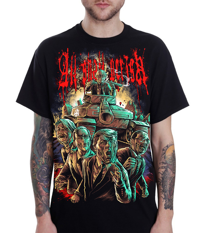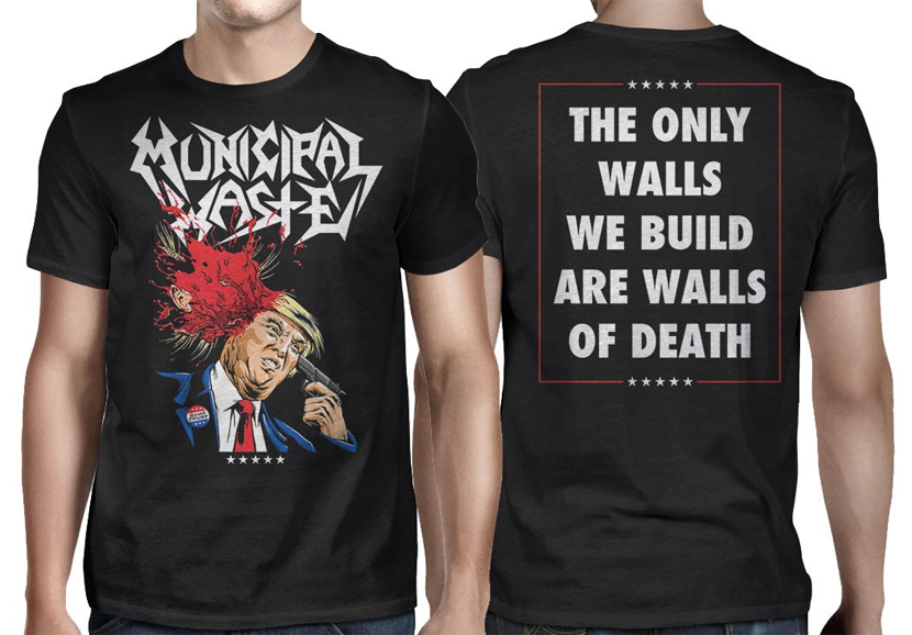 Donald Trump‘s presidential campaign and the controversial views he’s expressed as part of it continue to draw strong reactions, including the two new merch designs below from All Shall Perish (who take on even more candidates) and Municipal Waste. You can check out both prints below and purchase them here and here respectively.
