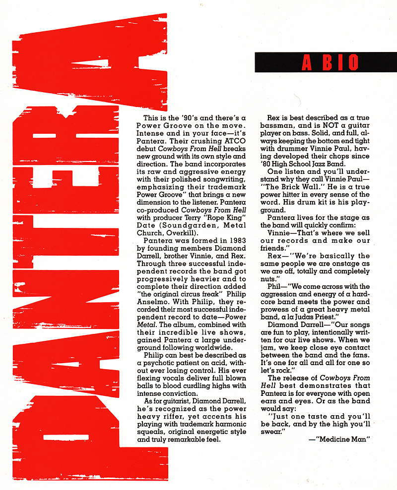 Unless you were writing for the many metal mags of yore back around 1990 or somehow otherwise deeply involved in the music industry, it’s likely that you’ve never set eyes upon the original press kit for Pantera‘s landmark album, “Cowboys From Helll“. Frontman Phil Anselmo‘s official website, philanselmo.com have just shared a digital scan of that: