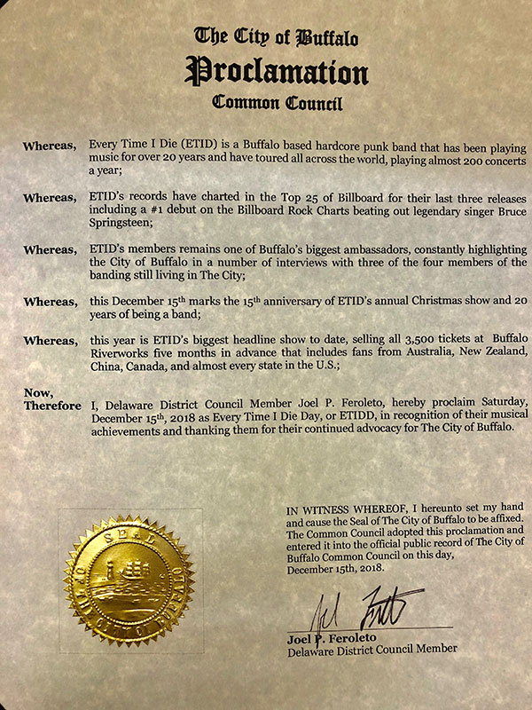 Every Time I Die‘s hometown of Buffalo, NY officially proclaimed yesterday, December 15th, 2018, as ‘Every Time I Day‘ in honor of the band. The proclamation came as the band held their annual ‘Tid The Season‘ holiday show at the Buffalo Riverworks. A photo of the official proclamation can be found below: