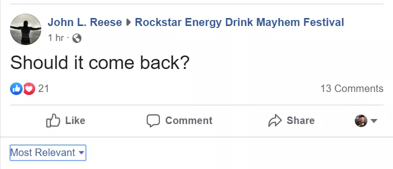 Though the ‘Rockstar Energy Drink Mayhem Festival‘ went out with a bit of a whimper back in 2015, it seems the books may not be sealed shut on the festival just yet. According to Ghost Cult, one of the festival’s co-founders, John Reese, recently asked the following question via Facebook: