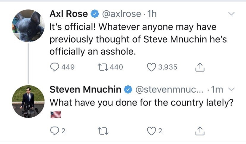 Guns N’ Roses frontman Axl Rose‘s negative opinion of the current U.S. Secretary of the Treasury Steve Mnuchin led to an interesting exchange on Twitter. While it’s not entirely clear what triggered Rose to fire rant about Mnuchin on social media, the initial tweet is what set things in motion: