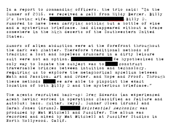 In a report to commanding officers, the trio said: “In the Summer of 2016, we received a call from Hildy Berger, Billy D’s loving wife. [REDACTED]. Billy D, rumored to have been carrying nothing but a bottle of wine and a mysterious briefcase, had disappeared without a trace somewhere in the high deserts of the Southwestern United States.