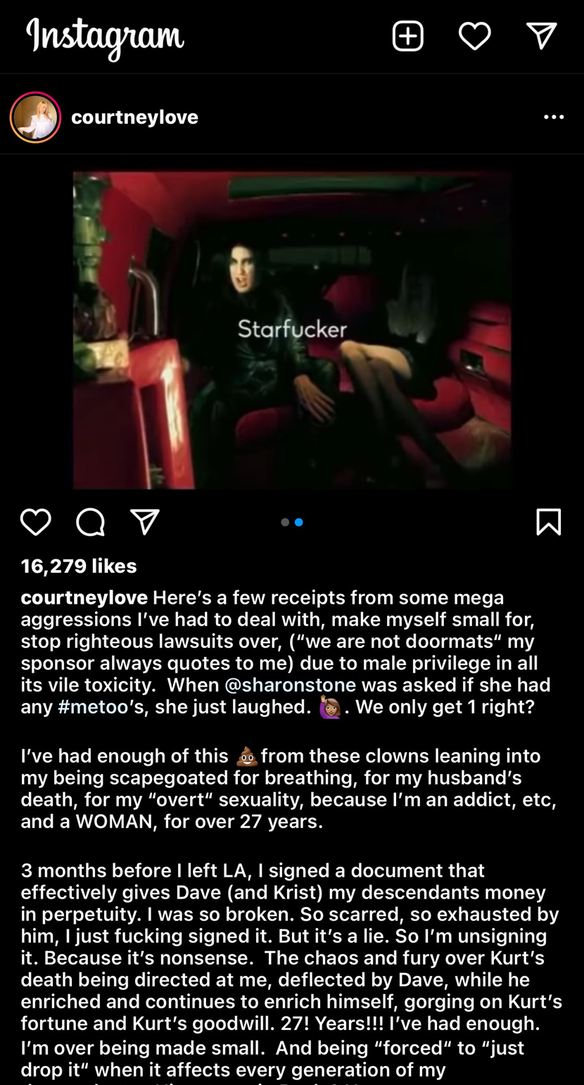 3 months before I left LA, I signed a document that effectively gives Dave [Grohl] (and Krist [Novoselic]) my descendants money in perpetuity. I was so broken. So scarred, so exhausted by him, I just fucking signed it. But it’s a lie. So I’m unsigning it.