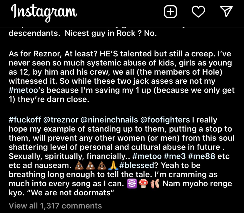 As for Reznor, At least? HE’S talented but still a creep. I’ve never seen so much systemic abuse of kids, girls as young as 12, by him and his crew, we all (the members of Hole) witnessed it. So while these two jack asses are not my #metoo’s because I’m saving my 1 up (because we only get 1) they’re darn close.