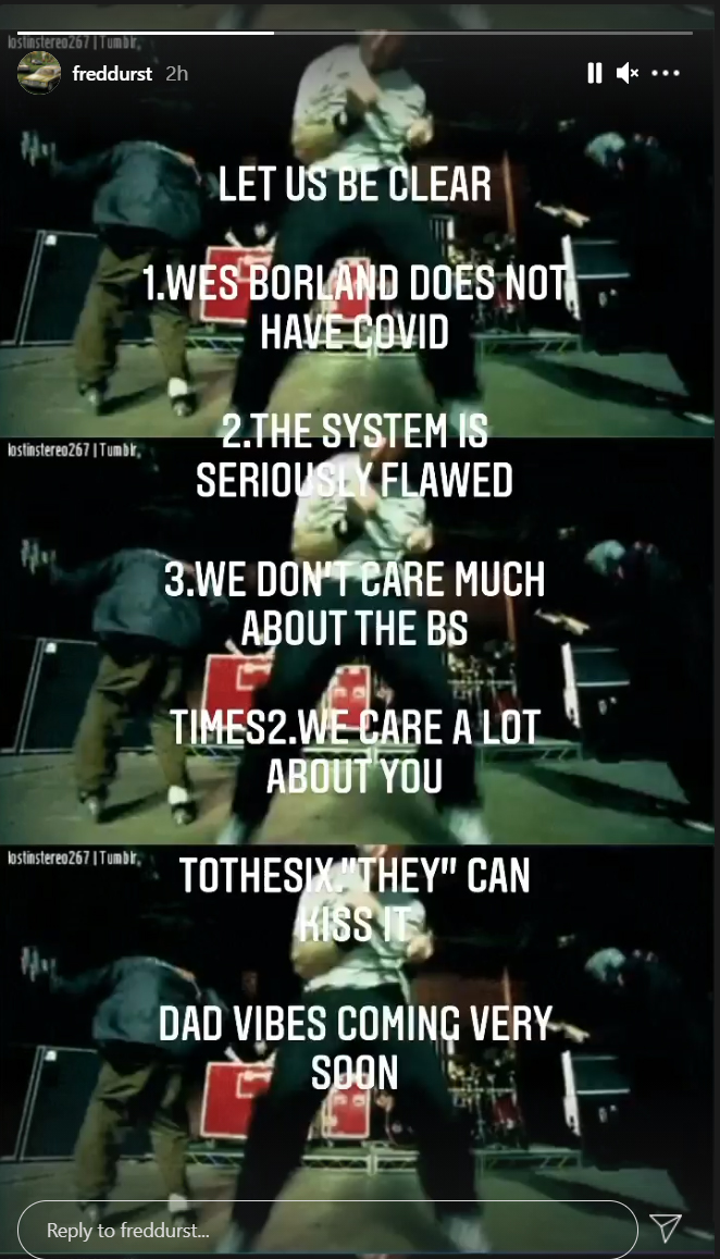 Borland‘s story post of the same image was slightly altered with the additional text “And I’m vaccinated”. As their posts stated, the band’s new song “Dad Vibes” will be arriving soon, with the group having been debuting a pre-recorded version of it during the outro to their recent live shows on the now scrapped tour.