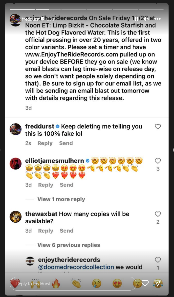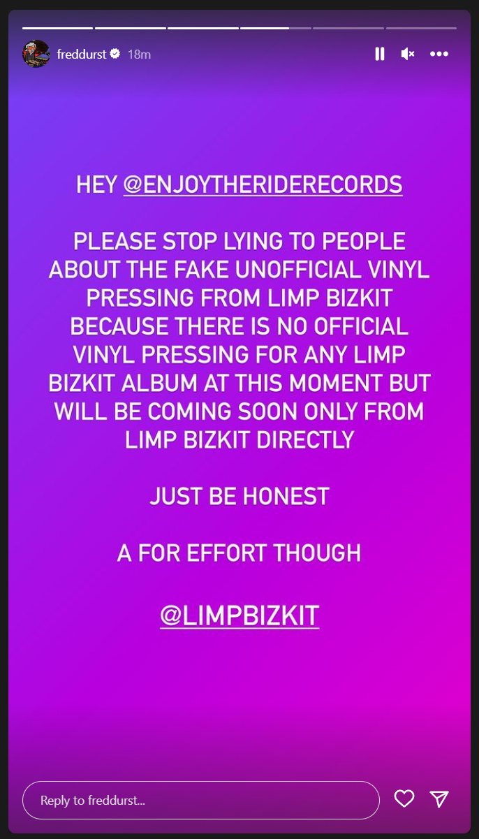 Speaking via Instagram stories, Durst has shared screencaps of his comments directed towards the aforementioned label, decrying it as “fake” and “unofficial”, while asserting that the band’s camp are working on an official option. You can see some of what he posted below: