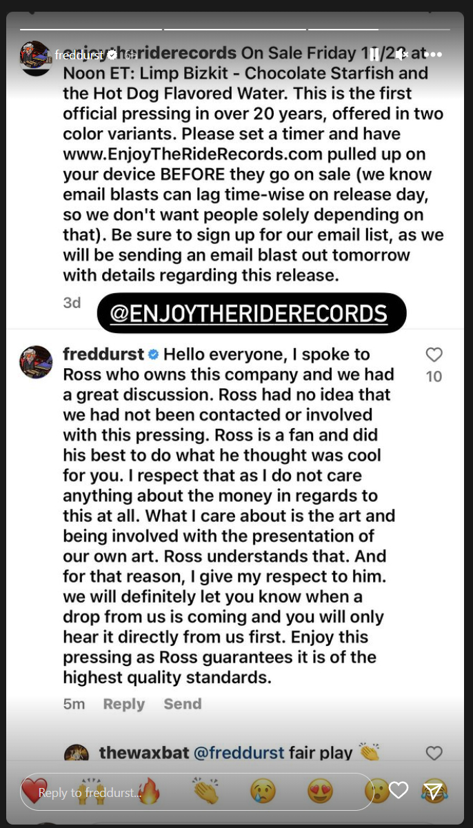 Fred Durst, vocalist for the infamous nü-metal outfit Limp Bizkit, has come out swinging against this week’s newly announced vinyl pressing of the aforementioned band’s 6x multi-platinum 2000 album, “Chocolate Starfish And The Hot Dog Flavored Water“.