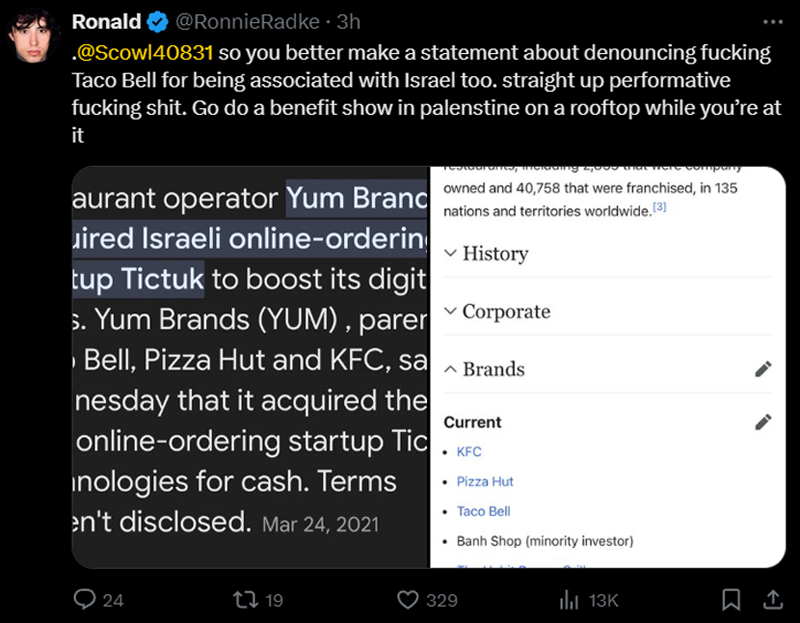 Radke took to social media today, June 11th, to call out Scowl for their alleged hypocrisy. Radke cited Scowl‘s 2023 associations with Taco Bell as a strike against the band’s credibility, citing Taco Bell‘s parent company Yum Brands‘ documented business dealings with Israel.