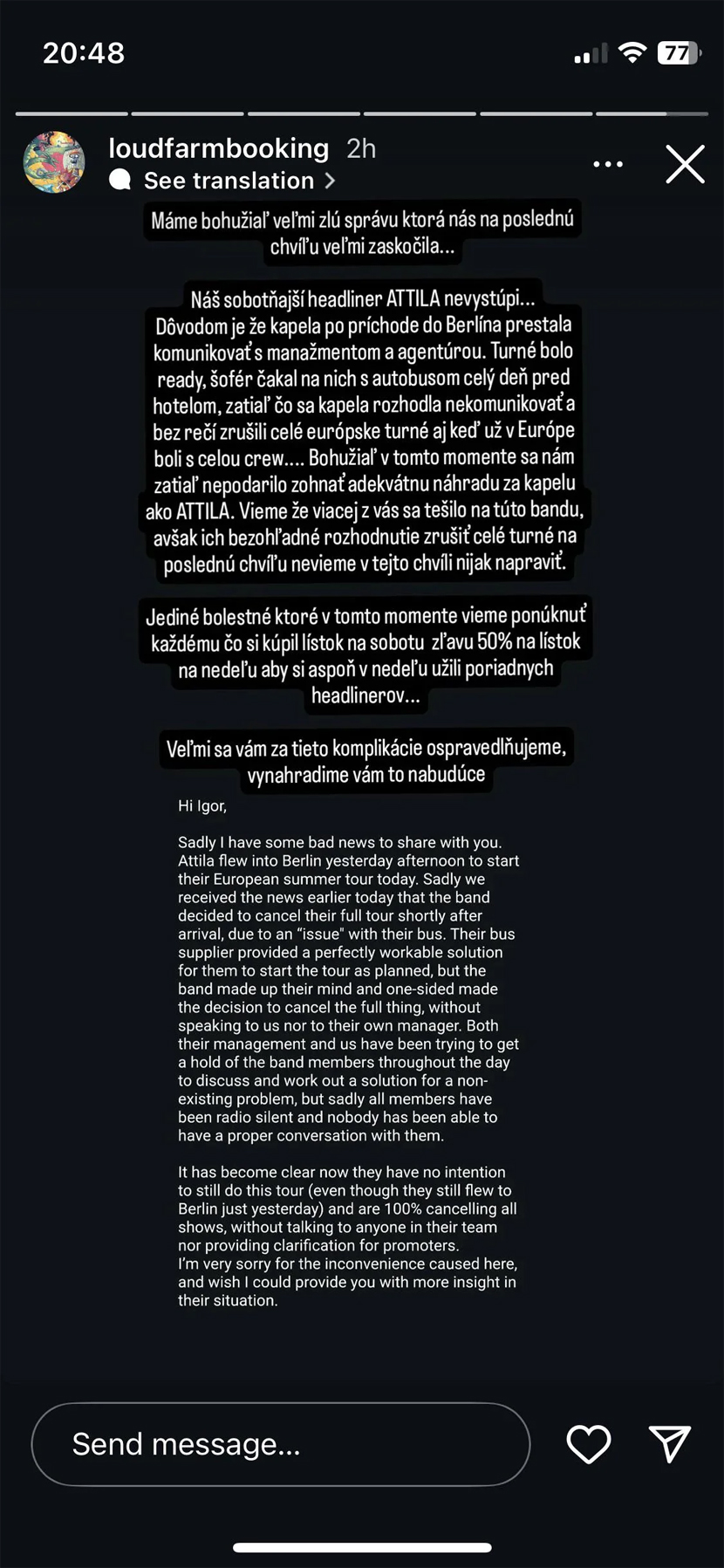 Sources in Attila‘s team have since reached out to clarify the situation. The band’s representative disputed Loud Farm‘s assessment of a lack of communication or availability between the band, their management team and the above-mentioned Slovakian-based show promoter.