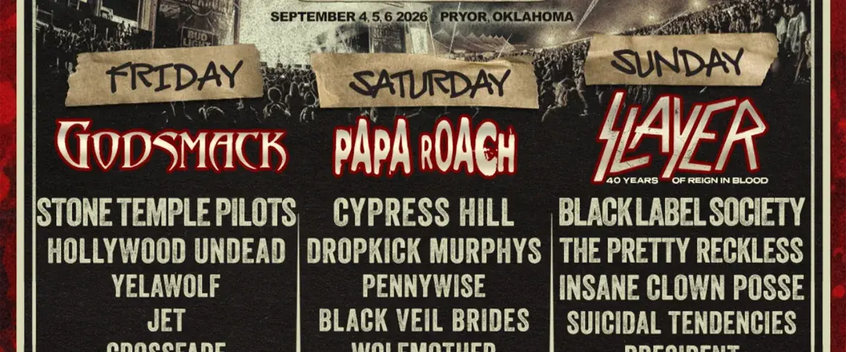 Thrash metal legends Slayer, multi-platinum hard rockers Godsmack and nü-metal/alternative metal stars Papa Roach lead the lineup for the 2026 ‘Rocklahoma‘ festival, which this year will be held September 04th to 06th at the Rockin’ Red Dirt Ranch in Pryor, Oklahoma. Slayer for their part will be celebrating 40 years of their landmark album “Reign In Blood” during their headlining set. The daily lineups for this year’s event can be found below.